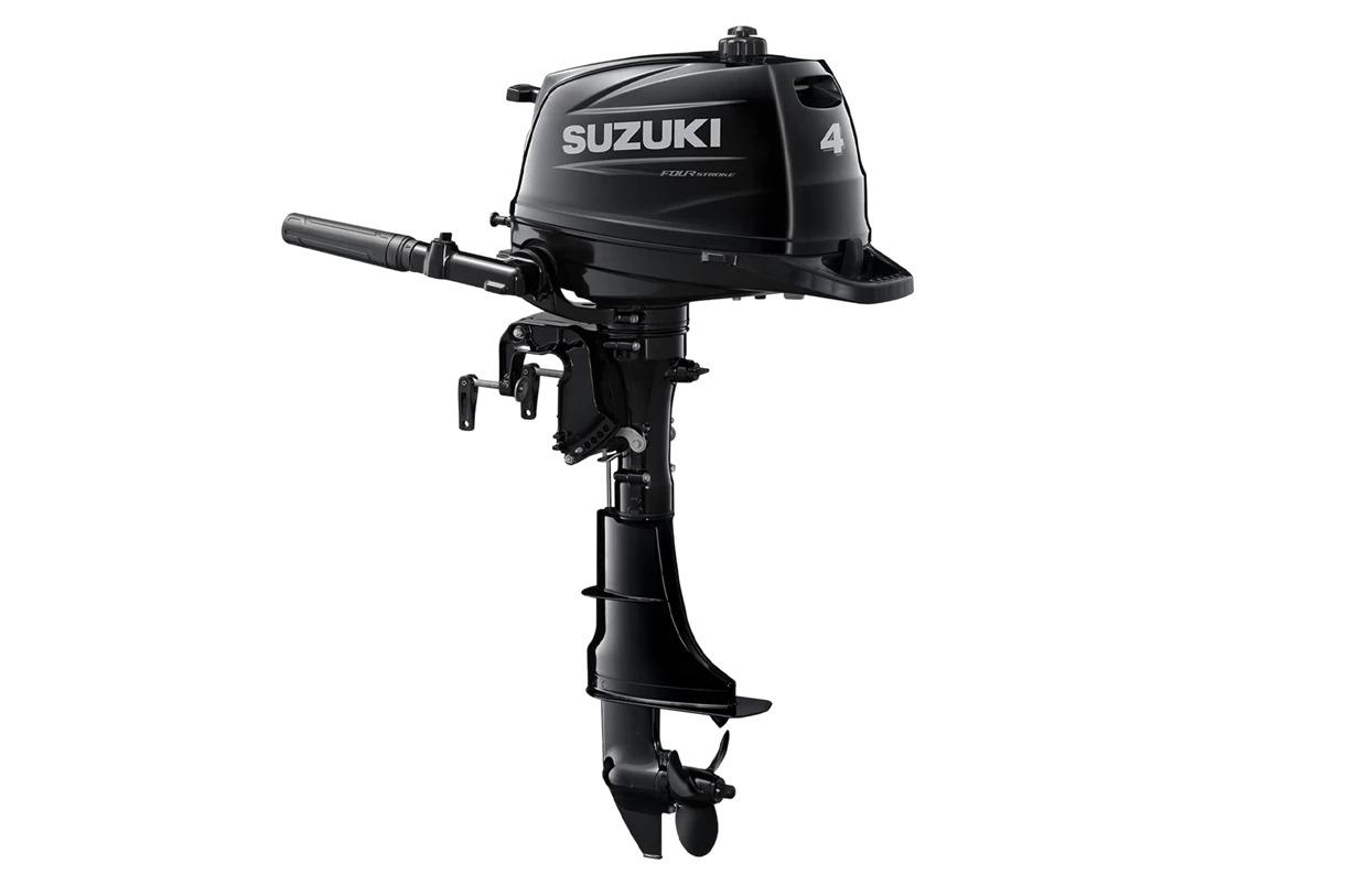 Suzuki DF4 AS5: 1 Cylinder, Carbureted, Manual Start, 15 in. Shaft, 55 lb. Dry Weight, Pearl Nebular Black. The Suzuki DF4A features a compact OHV 2-valve design with a 138cc displacement producing 4 HP and an operating range of 40005000 RPM. It offers a 12V 6A output, 5 tilt pin positions, and a 1.92:1 gear ratio for smooth performance and easy maneuverability, ideal for small boats, dinghies, and inflatables.